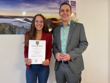 Aufgewachsen ist die 25-Jährige in Gundelfingen an der Donau. Nach ihrer 2018 abgeschlossenen Ausbildung mit der Fachrichtung Verwaltung beim Landratsamt Dillingen war sie dort bereits in der Asylsachbearbeitung tätig, wo sie schon viel Berufserfahrung sammeln konnte. Die frisch gebackene Verbandsgemeindeobersekretärin freut sich auf die anstehenden Aufgaben.
